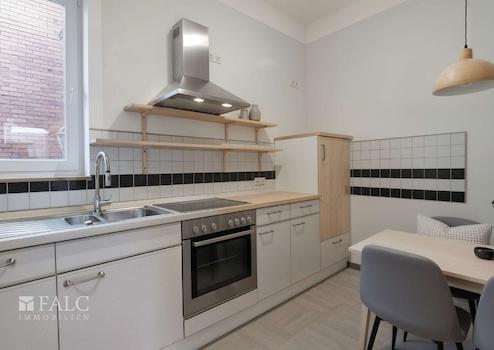 Die vom Vermieter unentgeltlich zur Verfügung überlassene Küche ist mit einer Einbauküche ohne Elektro Geräte ausgestattet. Diese kann nach eigenen wünschen ergänzt oder entfernt werden.