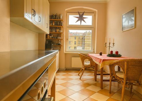 Die Küche blickt auf den grünen Innenhof und sorgt für ein besonders angenehmes Wohngefühl. Eine freundliche Hausgemeinschaft rundet das Gesamtbild ab.