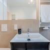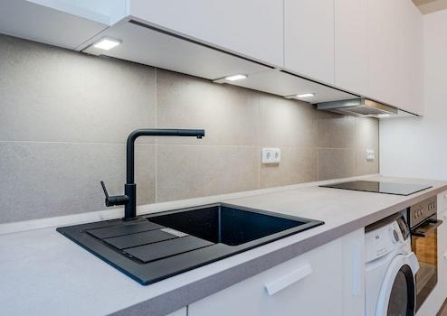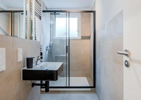 Moderne Küche mit AEG Wasch/trockener Kombination, Geschirrspüler, Herd/Ofen und großer Kühl/Gefrier Kombi, Badezimmer mit Dusche und Handtuchwärmer