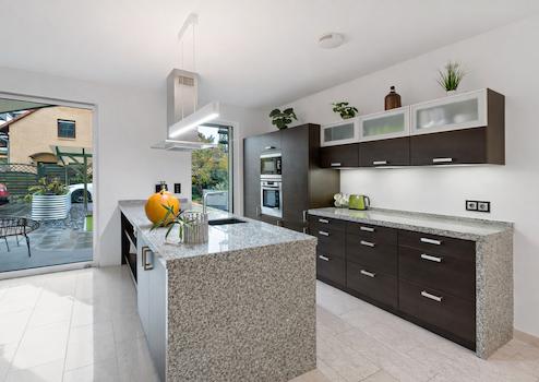 Im Erdgeschoss stehen ca. 100 Quadratmeter Wohnfläche zur Verfügung. Herzstück ist das großzügige Wohnzimmer mit offen gestalteter Küche. Die hochwertige Einbauküche mit Granitarbeitsplatte fügt sich harmonisch in den Wohnraum ein und erfüllt höchste Ansprüche an Design und Funktion.
