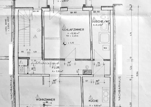 Das Dreifamilienhaus mit ca. 210 m² Wohnfläche besteht aus Erdgeschoss (vermietet, Kaltmiete 280,- EUR) Zweizimmerwohnung mit sep. Küche und Duschbad und 4,86 m² Balkon: 56,08 m² zzgl. 36 m² Terrasse über der ...