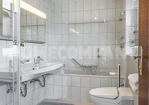3. Stock mit Lift. Kombinierter Wohn-/Schlafraum mit komfortablem Doppelbett und kleinem Tisch mit Stühlen und Esstheke. Im Wohn-/Schlafraum integrierte Kochnische mit Backofen. Weißes Bad mit Badewanne. Im Flur ...