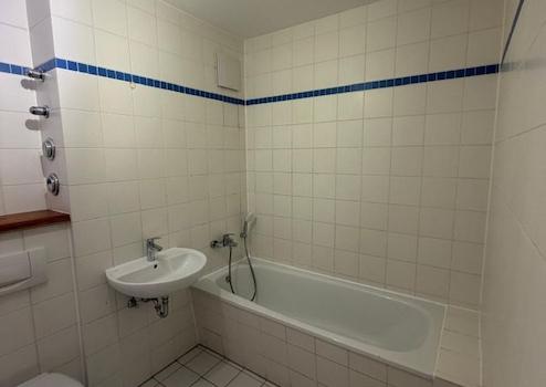 - Badezimmer mit Badewanne und Waschmaschinenanschluss
