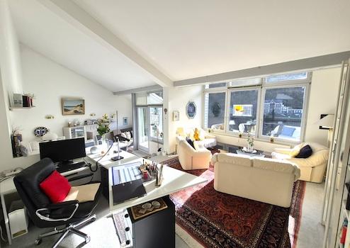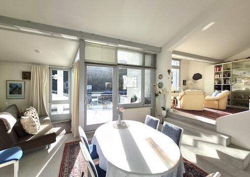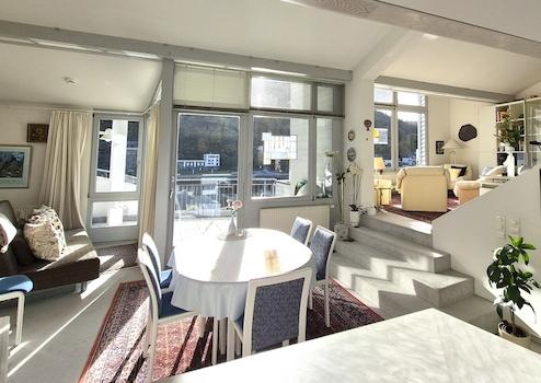 Große Fensterflächen sowie unterschiedliche Deckenhöhen und Details in der Ausformung der Räume machen diese Wohnung zu einem Unikat.