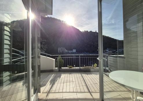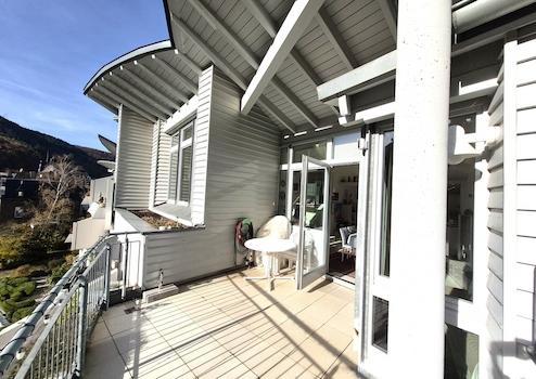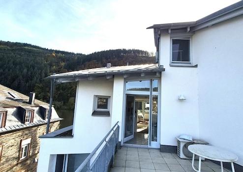 Die Wohnung bietet Ihnen zwei große Freisitze mit wunderschönen Ausblicken ins Moseltal und über die Dächer von Traben-Trarbach. In der nach Süden ausgerichteten und teilweise überdachten Loggia genießen Sie den ganzen Tag die Sonne. Die große Dachterrasse an der dem Ort zugewandten Seite ist nach Osten ausgerichtet und liegt in der Morgensonne.