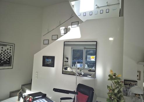 Im Obergeschoss wurden ein Bad und ein Schlafzimmer sowie ein kleiner Abstellraum eingerichtet. Das Schlafzimmer verfügt über eine außergewöhnliche Deckengestaltung, die von den lichten Höhen her stark variiert. Für sehr warme Sommermonate wurde eine Klimaanlage eingebaut.