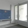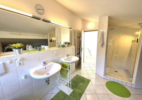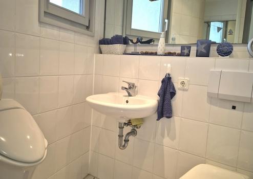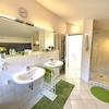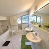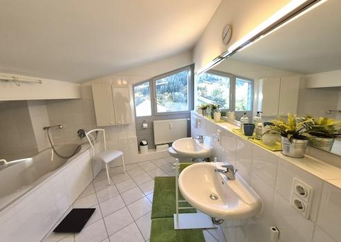 Das Bad verfügt über eine Fußbodenheizung und ist ausgestattet mit Dusche, Wanne, zwei Waschbecken sowie einem Waschmaschinenstellplatz.