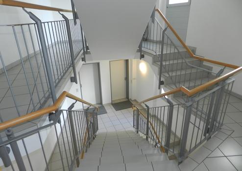 Die Wohnungseingangstür ist durch einen Aufzug zu erreichen. Innerhalb der Wohnung sind zwischen Esszimmer und Wohnzimmer 4 Stufen vorhanden und das Schlafzimmer und das Bad erreicht man über eine Treppe. Die Wohnung ist daher nicht barrierefrei zu gestalten.