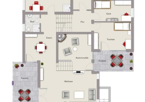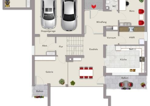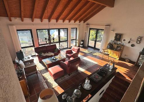 Die offene Split-Level-Architektur mit versetzten Ebenen, beeindruckenden Deckenhöhen und großzügigen Blickbeziehungen schafft eine besondere räumliche Dynamik. Beim Betreten empfängt Sie ein heller Flur, der Zugang zu einem Gäste-WC und einem Büro für das Homeoffice bietet. Die zentrale Essdiele verbindet Küche, Wohnbereiche und Balkon und bildet das Herzstück des Hauses. Über eine halbe Ebene gelangt man in das beeindruckende Wohnzimmer mit großzügiger Raumhöhe und großen Fensterfronten, das sich zum angrenzenden Wohn- und Essbereich und der Terrasse mit Zugang zum gepflegten Garten öffnet. Eine Kaminmulde sorgt hier für gemütliche Stunden - ebenfalls mit Zugang zur eigenen Terrasse.