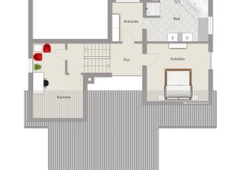 Im Dachgeschoss erwarten Sie ein großzügiges Schlafzimmer, ein Ankleidezimmer mit Zugang zum geräumigen Badezimmer, ein Kinderzimmer und ein praktischer Abstellraum über der Garage.