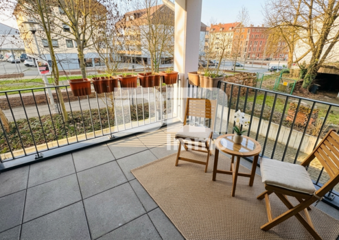 Von hier aus gelangen Sie direkt auf die charmante große Loggia / Terrasse, die mit hochwertigen Platten ausgelegt ist und zum Entspannen im Freien einlädt.