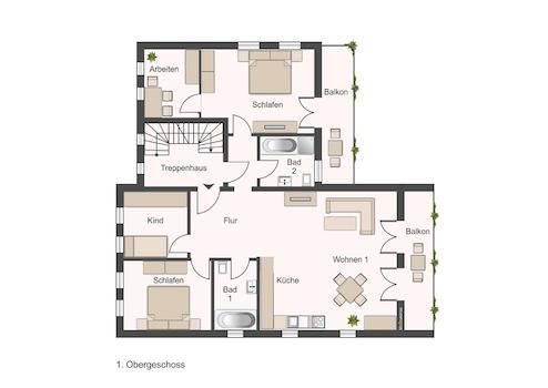 Die Wohnung im Obergeschoss bietet auf ca. 119 m² fünf gut geschnittene Zimmer, einen offenen Wohn- und Essbereich mit ca. 38 m² Fläche sowie zwei Bäder. Zwei große Balkone ermöglichen entspannte Ausblicke ins Grüne und machen die Wohnung zu einem perfekten Rückzugsort für Familien.
