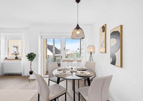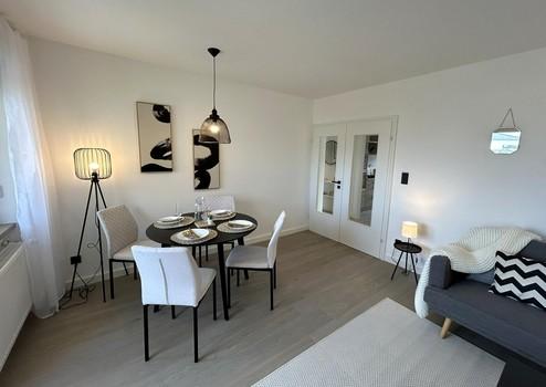 Der großzügige Wohn- und Essbereich bildet das Herzstück der Wohnung und öffnet sich zum sonnigen Balkon – ein idealer Ort, um den Tag entspannt ausklingen zu lassen.