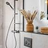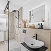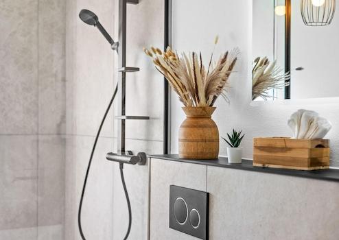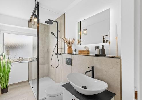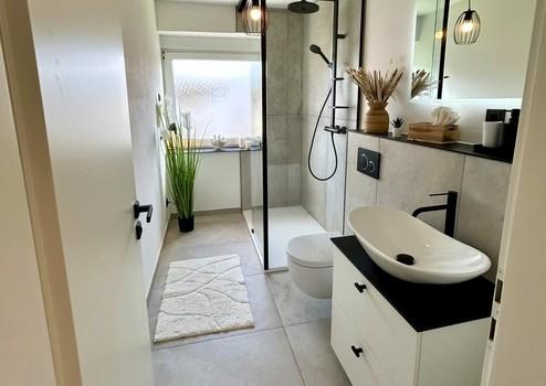 Das vollständig neue Bad überzeugt mit ebenerdiger Walk-in-Dusche, Regendusche und durchgehendem schwarzen Designkonzept – ein Ort zum Ankommen und Wohlfühlen.