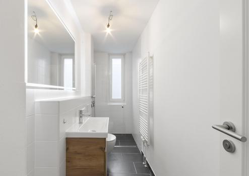 - Modernes Tageslicht-Bad mit Waschtischunterschrank, Leuchtspiegel und geräumiger Dusche