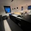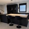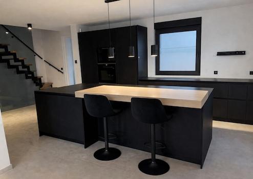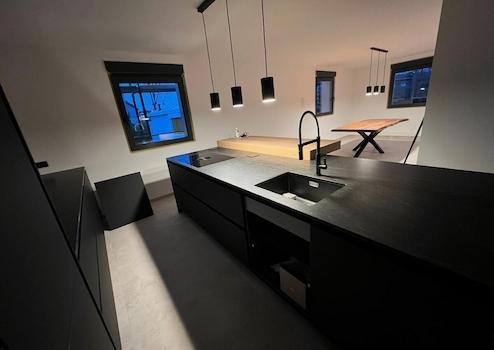 Ein absolutes Highlight ist die maßgefertigte Premium-Küche in elegantem Schwarz-Matt mit großzügiger Kochinsel und Bartheke.