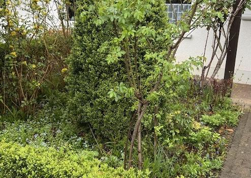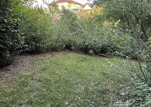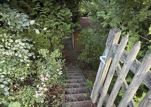 Vor dem Haus befindet sich ein Autostellplatz. Getrennt durch die ruhige Anliegerstraße gehört ein rd. 344 m² großer Naturgarten mit Geräteschuppen und kleiner Terasse dazu.