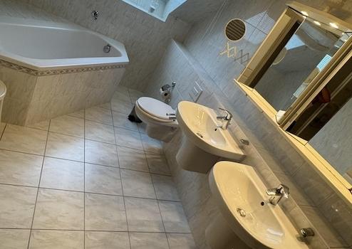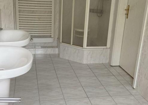 Großzügiges Tageslichtbad: komfortable Eckbadewanne und Dusche, Doppel-waschtische, helle, zeitlose Fliesen