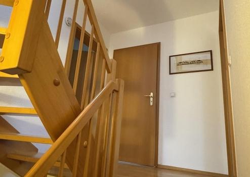 Die offene Holztreppe verbindet die Etagen elegant und schafft ein warmes Wohngefühl.