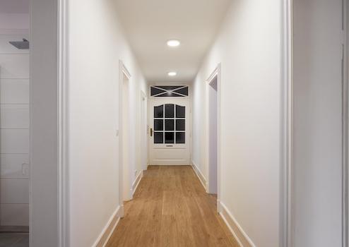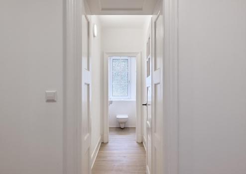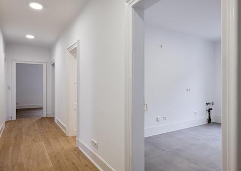 Die Wohnung hat einen breiten Flur, von dem Küche, Gäste-WC, Bad und alle Zimmer erreichbar sind. Eine große Küche, in der eine großzügige Einbauküche Platz findet und zudem Platz für einen Tisch mit 4-6 Stühlen bietet. Vor dem Gäste-WC ist Platz für eine Garderobe. Das große Bad ist neu gefliest mit einer Walk-In-Dusche, einer Badewanne einem zusätzlichen WC, einem großen Handwaschbecken und Platz für Waschmaschine und Trockner nebeneinander. Es gibt ein straßenseitiges Zimmer und zwei große Zimmer zum Hof. Es sind nur hochwertige Materialien u.a. für die Steckdosen und Schalter (Jung) Objekte (Duravit) und Objekte (Hans Grohe) verbaut.