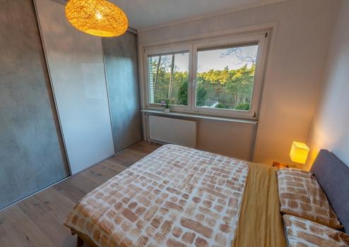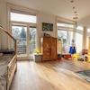 Das Obergeschoss umfasst über 100qm Wohnfläche, verfügt über Fußbodenheizung in der Küche, im Bad und im Wohnbereich. Das Wohnzimmer hat eine wunderbare Höhe von teilweise über 4m und raumhohe Fenster mit Austritt auf die Terrasse und den Balkon. Momentan gibt es auf dieser Ebene 2 Schlafzimmer, wobei das größere durch Zusammenlegung von 2 Kinderzimmern entstanden ist und somit gut wieder geteilt werden kann (ebenfalls jeweils bodentiefe Fenster mit Austritt auf den Balkon). Aus dem Schlafzimmer und dem Badezimmer hat man eine Aussicht in den Wald die ihresgleichen sucht. Die Böden sind saniert und in sehr gutem Zustand. Die Wände sind glatt verputzt.