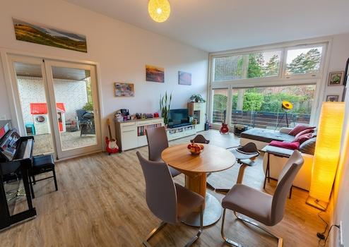 Das Erdgeschoss umfasst ebenfalls 100qm und verteilt sich auf ein großes (Wohn-)Zimmer und ein Schlafzimmer (beide mit bodentiefen Fenstern zur teilüberdachten Terrasse) sowie ein Duschbad, eine Küche und ein Büro. Hier gibt es Laminat und Fliesen als Bodenbelag.