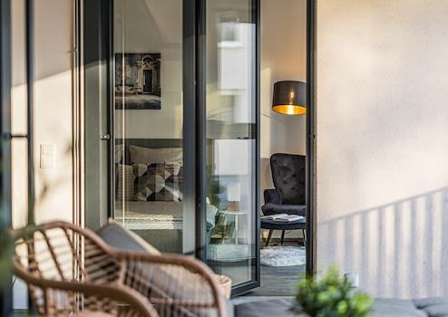 Großzügige bodentiefe Fenster sorgen in allen Wohnräumen für ein außergewöhnlich helles und offenes Raumgefühl und schaffen eine direkte Verbindung zwischen Innen- und Außenbereich. Der große, nach Süden ausgerichtete Balkon erweitert den Wohnraum nach draußen und lädt zu entspannten Stunden im Freien ein. Für zusätzlichen Komfort und optimalen Sonnen- sowie Sichtschutz sind elektrische Außenjalousien installiert, die eine flexible Licht- und Klimaregulierung ermöglichen.