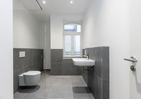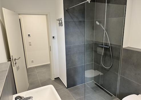 Das luxuriöse Badezimmer überzeugt mit modernen Materialien (Fließen 60x60cm) und einer großzügigen Regenbogendusche.