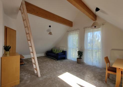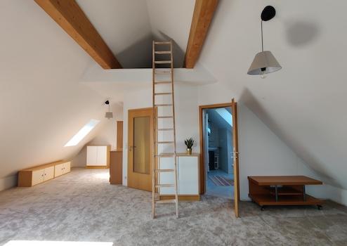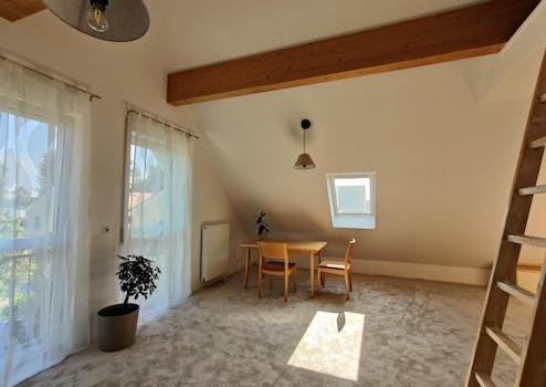 Das geräumige Dachgeschoss mit offenem Giebel können Sie hervorragend als separaten Gästebereich, helles Home-Office oder großzügiges Spiel- und Kinderzimmer nutzen. Ein Bad mit Tageslicht und Wandheizkörper sowie Anschlüsse für eine Küchenzeile sind vorhanden, so dass Sie das Dachgeschoss auch als separate Wohnung verwenden können.