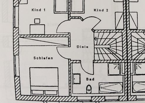 Im ersten Obergeschoss befinden sich drei Zimmer als Schlaf-/Kinder-/Arbeitsräume. Das Bad hat Fußbodenheizung und Wandheizkörper, Dusche, Badewanne und zwei Waschbecken.
