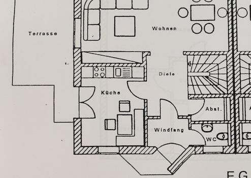 Bei Einbau einer neuen Küche wäre der Wechsel des Bodenbelages empfehlenswert.