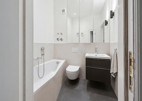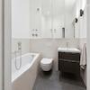 Das modern gestaltete Badezimmer verfügt über eine Badewanne und eine separate Dusche.