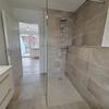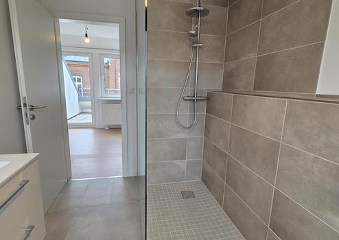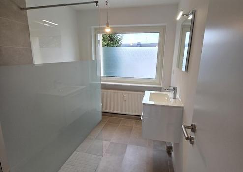 Das Badezimmer wurde vollständig erneuert, inklusive aller Leitungen, und überzeugt durch ein zeitgemäßes Design in hellen, grau-beigen Farbtönen. Die Wände sind mit großformatigen Fliesen (30 × 60 cm) ausgestattet, während der Duschbereich mit Mosaikfliesen akzentuiert wurde. Die bodengleiche Dusche verfügt über eine Glasabtrennung sowie eine Regendusche und eine zusätzliche Handbrause. Ergänzt wird die Ausstattung durch ein wandhängendes, spülrandloses WC mit Unterputzspülkasten sowie einen modernen Waschtisch mit beleuchtetem Spiegel und hochwertigen Armaturen.