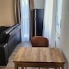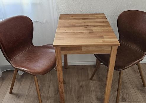 Schrank, Sideboard, Teppich, Ledersofa, kleiner Esstisch mit zwei Stühlen. Zusätzlich ist noch ein Kühlschrank mit Gefrierfach.