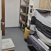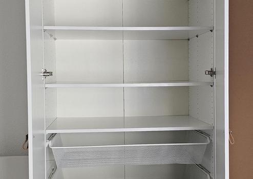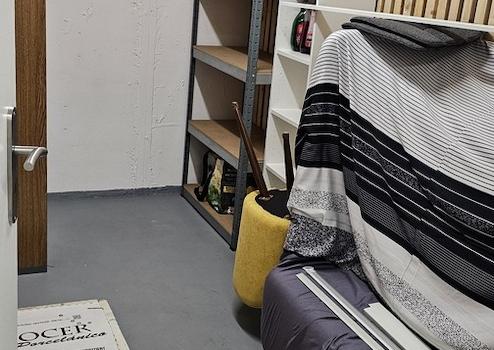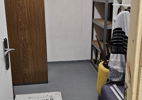 Abschließbarer Kellerraum mit Schränken und Regalen.
