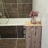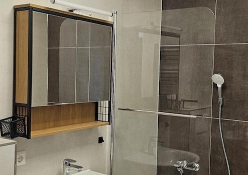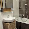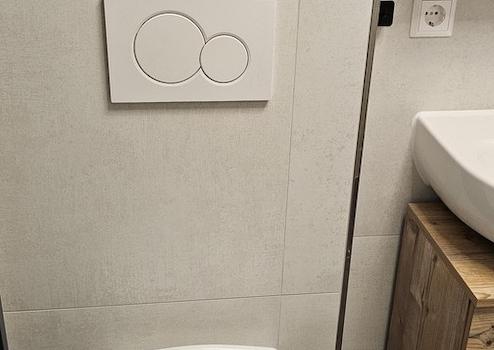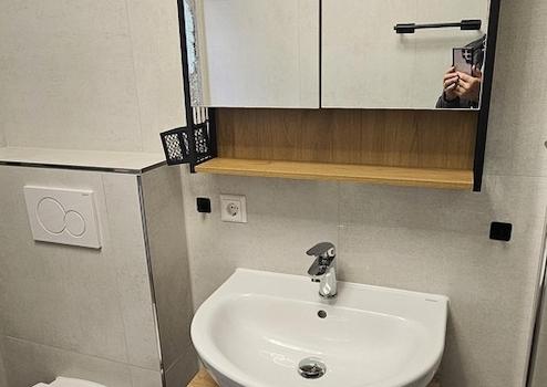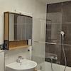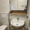 Bad mit Badewanne und WC ohne Fenster, Wände bis zur Decke und Boden NEU verfliest. Inklusive Hängeschrank, Unterschrank und einem kleinem extra Schrank. Waschbecken, Toilette, Heizkörper usw. alles NEU.