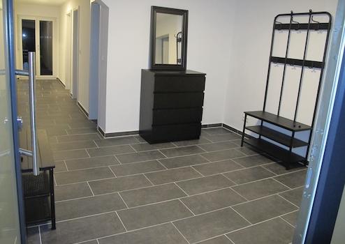 Beim Betreten der Wohnung überrascht der große Flur. Von hier gehen alle Räumlichkeiten ab.