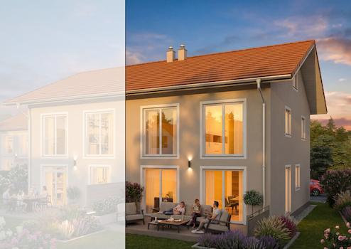 Der Kaufpreis beinhaltet das Grundstück sowie die vollständige Neuerrichtung der Doppelhaushälfte in hochwertiger Ausführung. Die dargestellten Visualisierungen und Grundrisse dienen der Veranschaulichung des genehmigten Haustyps; geringfügige Abweichungen im Detail sind je nach finaler Planung möglich.