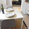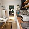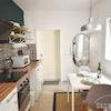 Dieses geschmackvoll möblierte Apartment liegt sehr ruhig zum Innenhof des Hauses. Vom Eingang des Apartments, gelangt man in einen kleinen Flur von dem das Badezimmer abgeht. Weiter geht es in die offene Küche mit einem Tisch für 2 Personen.