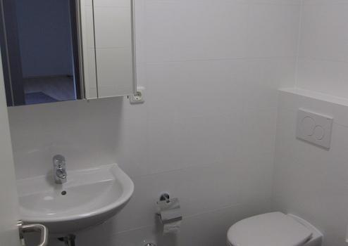 Die Bad-Ausstattung beinhaltet Spiegelschrank mit Zusatzleuchte.