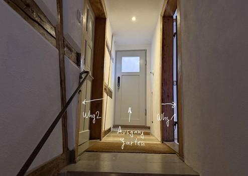 Über einen geschlossenen Innenhof, der auch als Autoabstellplatz für ein kleines Auto genutzt werden kann, gelangt man über eine Treppe zu den beiden Wohnungseinheiten.