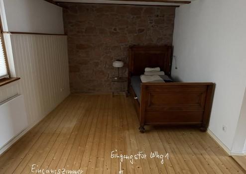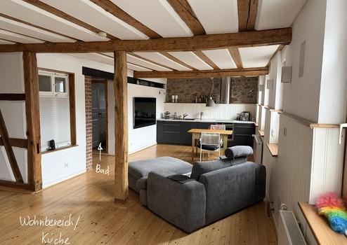 Die rechte Wohnungseinheit (Whg. 1) mit 77 qm besteht aus einem Eingangsraum, dem Bad mit begehbarer Dusche, dem Wohn-Essbereich mit Einbauküche und Kaminofen sowie einem weiteren kleinen abgetrennten Raum. Diese Einheit wurde 2014 kernsaniert.