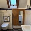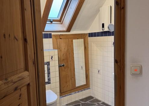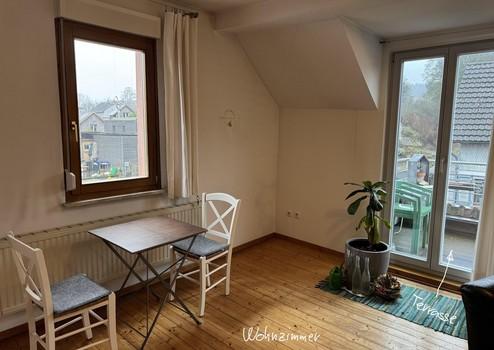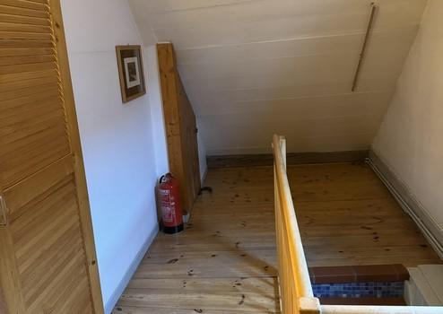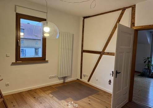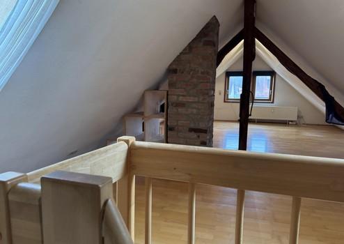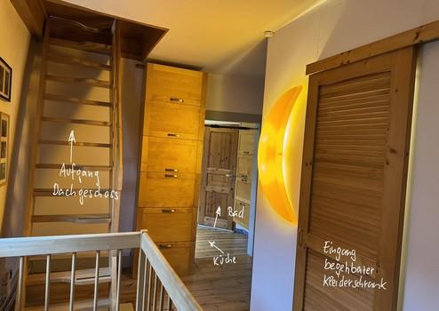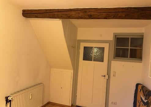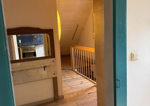 Die linke Wohneinheit (Whg. 2) mit 90 qm besteht aus einem Zimmer in gleicher Höhe wie Wohneinheit 1. Über eine Treppe gelangt man in den oberen Wohnbereich mit Küche, Bad und Wohnzimmer. Ein weiteres Zimmer wurde 2022 kpl. neu aufgebaut. Über eine Holztreppe gelangt man in das ausgebaute Dachgeschoss. Zur Wohnung gehört eine kleine Dachterrasse.