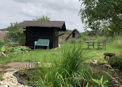 Zum Haus gehört ein separater ca. 360 qm großer Garten mit kleinem Teich und Gartenhütte. Dieser ist etwa 100 m vom Haus entfernt und über den Hinterausgang vom 1. Geschoss erreichbar.