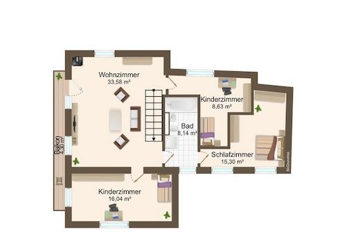 • Obergeschoss: Schlafzimmer mit Balkonzugang, zwei Kinderzimmer,
