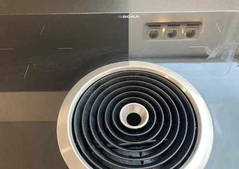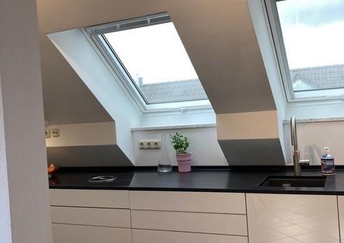 Rarität, Licht durchgeflutete 3 Zimmer, Dachgeschosswohnung, ca. 66 qm. Vom Flur aus gelangen sie ins Wohnzimmer mit offener Küche, Naturstein Arbeitsflächen, Bora Dunstabzug, Qooker Wasserspender, Siemens Herd und Geschirrspüler.