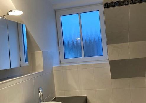 Bad mit extra großer Badewanne und niedrigem Einstieg , Designer Waschbecken, Mass angefertigte Duschwand, Fenster, Waschmaschinen Anschluss.