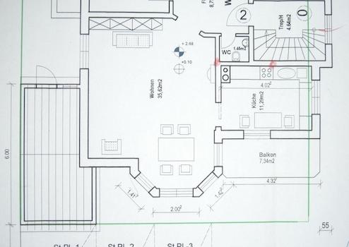 Herzstück der Wohnung ist das 36 m² große Wohnzimmer mit Zugang zur Sud Balkon. Einbauküche mit Elektrische Geräte: Cerankochfeld, Backofen, Kühlschrank, Dunstabzug ist vom Vermieter kostenfrei zur Verfügung gestellt.