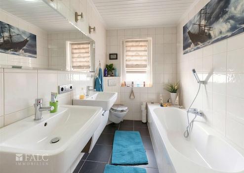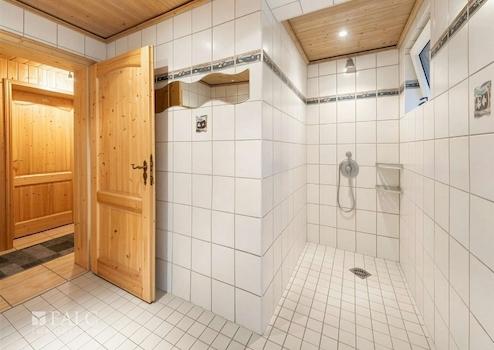 Das Badezimmer im Erdgeschoss ist mit einer Badewanne sowie einem Fenster ausgestattet und bietet damit sowohl Komfort als auch natürliche Belüftung. Im Untergeschoss befindet sich ein weiteres Badezimmer, das mit zwei Duschen ausgestattet ist und somit besonders für Familien oder eine flexible Nutzung geeignet ist.