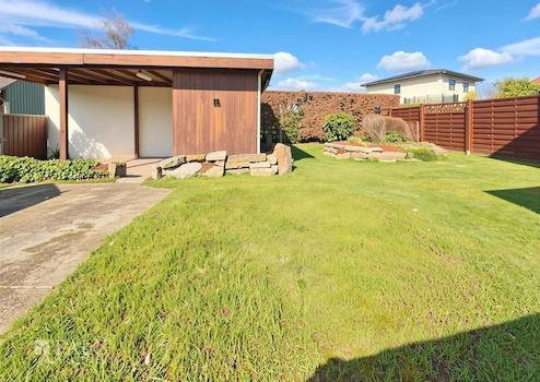 Der Garten bietet ausreichend Platz zur Erholung und individuellen Gestaltung. Eine vorhandene Gartenhütte schafft zusätzlichen Stauraum für Gartengeräte oder kann als kleiner Rückzugsort genutzt werden.